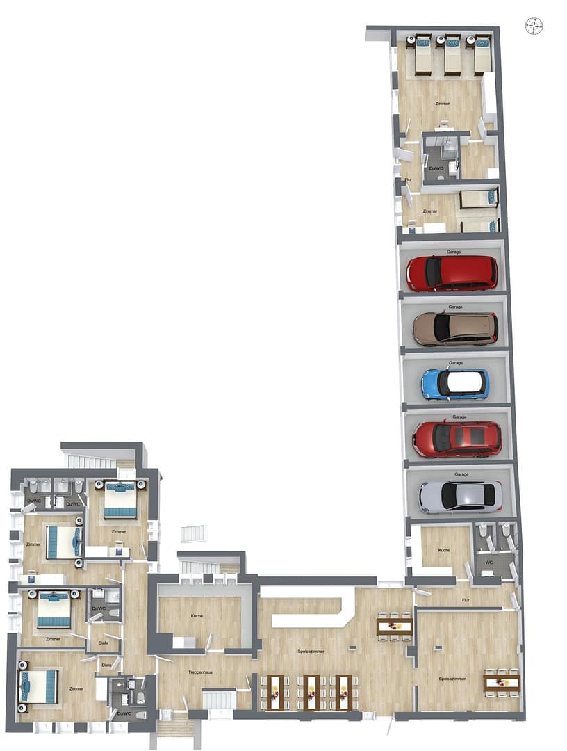 Nach Ausbau (rechter Flügel im Erdgeschoss): 18 Zimmer auf ca. 565 m² mit bis zu 44 Betten